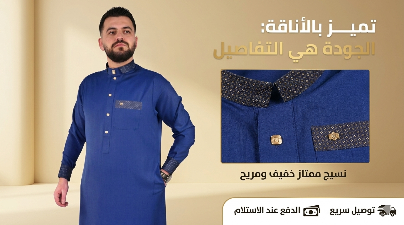 - تصميم عصري بلمسة تقليدية: يتميز بياقة (رقبة) وأكمام مزينة بنقوش هندسية دقيقة تضفي لمسة من الرقي